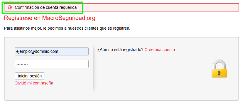Si recibe este mensaje, significa que si bien completo el formulario de registro, aún le falta confirmar su cuenta desde el enlace que se envió a su correo electrónico en el proceso de registración