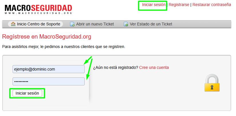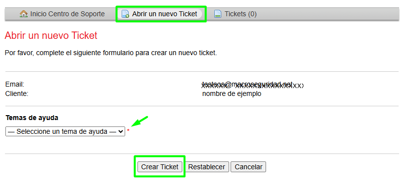 Haga click en Abrir un nuevo ticket y luego complete el formulario de acuerdo a sus necesidades