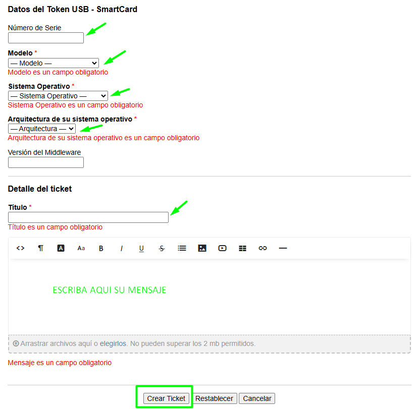 NOTA: Los campos marcados con * son obligatorios. Deberá completarlos para poder enviar el ticket