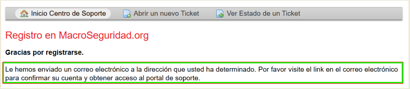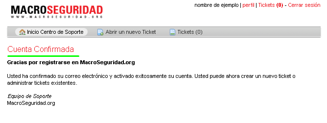 Luego de hacer click en el enlace, habrá confirmado su cuenta correctamente. Ya está en condiciones de abrir un ticket