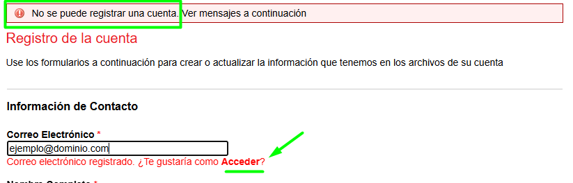 Si ud ya se había registrado con anterioridad e intenta hacerlo nuevamente; el sistema detectará un usuario con el mismo email y dará error.